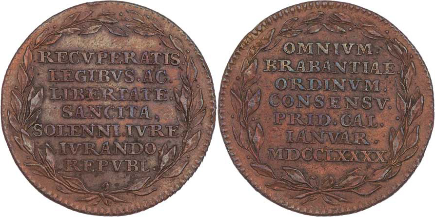 Brabantsko - AE jeton na vyhlášení samostatnosti 1790 - 7-řádk.nápis ve věnci/ 7-řádk.nápis ve věnci, 34mm, 12.581g, M.2195(AR), FW.II.11369, dr.hr., pat., téměř