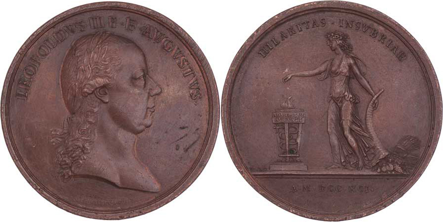 Guillermard - AE medaile na návštěvu Milána 1791 - poprsí zprava, opis / Lombardie u oltáře, opis, Sign., 49mm, 50.749g, PG.89, M.2252, hr., rysky R!