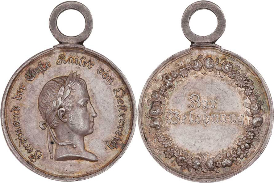 Böhm - školní prémie b.l. - poprsí zprava, německý opis / 2-řádkový nápis v květinovém věnci, Nesign., Ag 22 mm s původním ouškem, Haus.148, krásná pat. R!