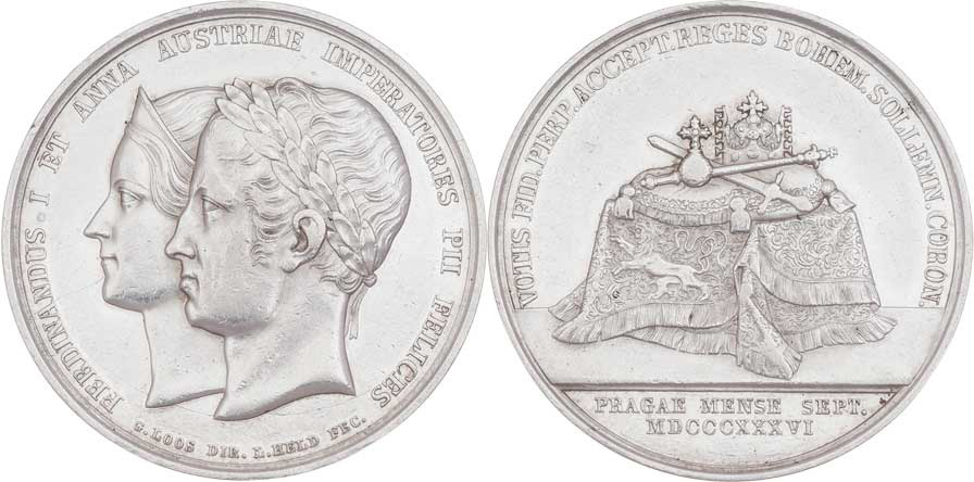 Loos a Held - AR medaile na korunovaci v Praze 1836 - dvojportrét zleva, opis/ korunovační klenoty na stole a písmo, Ag 39mm, 19.291g, ČS.1498, nep.hr., nep.rys.