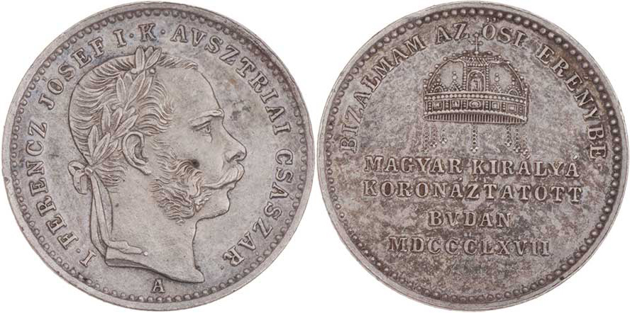 Menší maďarský peníz na korunovaci v Budíně 8.6.1867 - poprsí zprava, opis / koruna, opis a 4-řádk. nápis, Ag 20mm, 3.293g, M.2710, H.3795, Nov.B.6b, nep.rysky