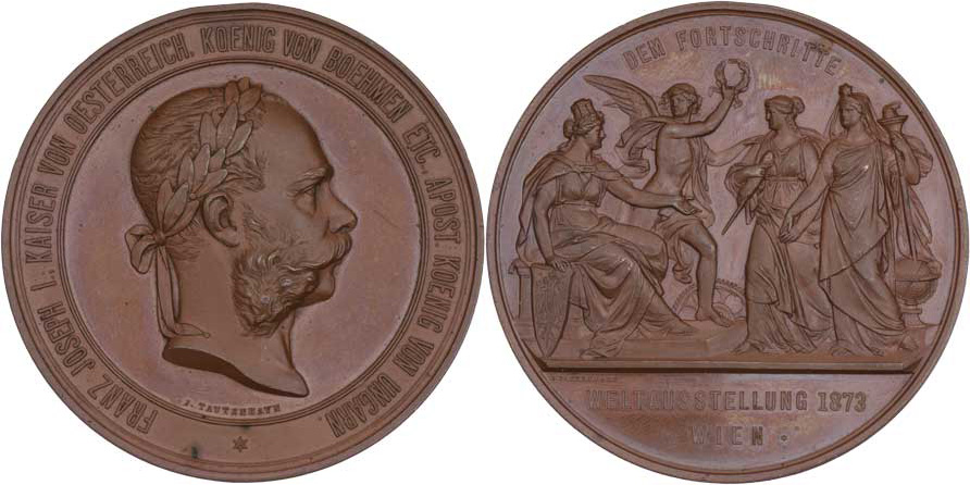 Tautenhayn - světová výstava 1873 - DEM FORTSCHRITTE - portrét zprava, něm.opis/ čtyři alegorické postavy, opis a nápis, Sign., měď 70 mm, Haus.2915, hr., pat.
