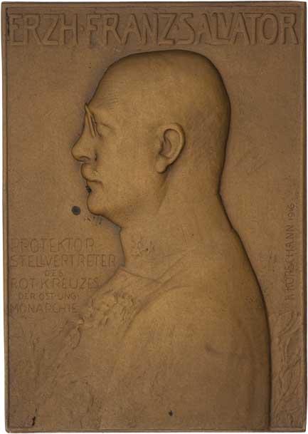 Korchann - pamětní plaketa 1916 - poprsí zleva, nápisy, Sign., patinovaný bronz 50x70 mm, pův.etue