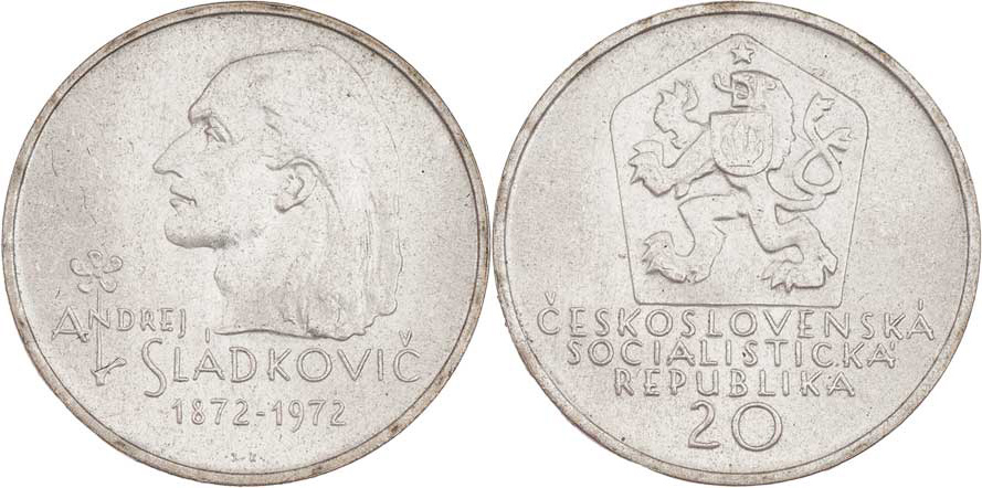 20 Kčs 1972 - Sládkovič - var."bokombrady" (licousy), 9.081g R!