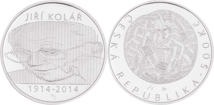 500 Kč 2014 - 100 let narození Jiřího Koláře, (Ag900, 25.0g, 9.800ks), kapsle, etue, karta
