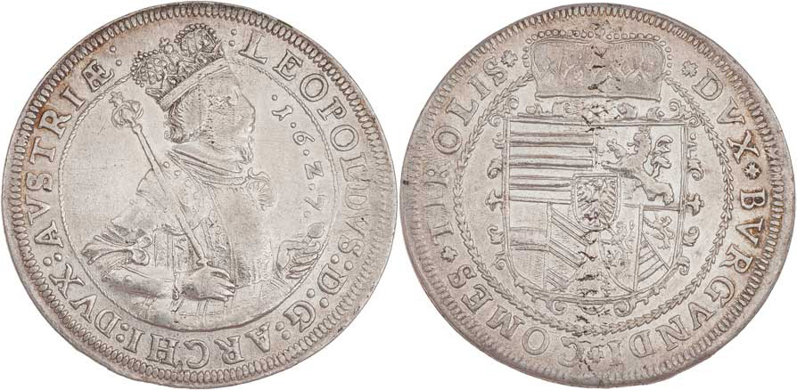 Tolar 1627, Hall, M-A.124, M-T.470, KM.629.1, světský šat, znak bez Zlatého rouna, koruna s perlami, opis končí "TIROLIS", 28.130g, dr.vady materiálu, vl.rysky