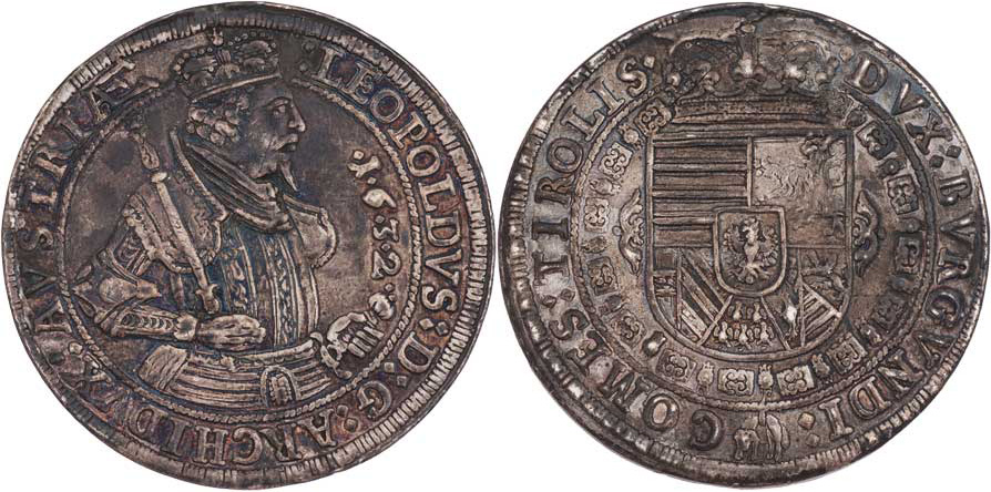 Tolar 1632, Hall, M-A.129, KM.629.2, M-T.473, světský šat, znak s řádem Zlatého rouna, koruna s perlami, ".TYROLIS.", 28.543g, nep.stopa po oušku, patina