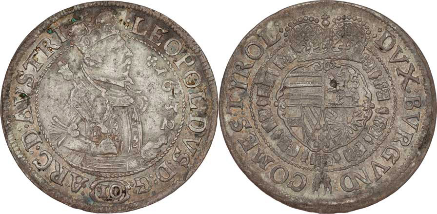 10 Krejcar 1632, Hall, M-A.129, KM.589.2, světský šat, koruna s perlami, kytička před letopočtem, 4.143g, dr.vady materiálu, nep.nedor., pěkná patina