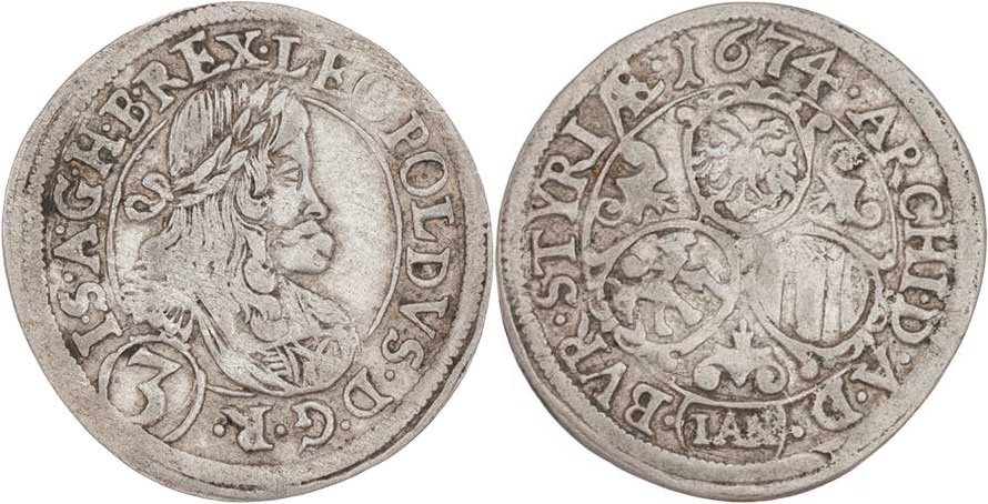 3 Krejcar 1674 IAN, Štýrský Hradec, Nech.2219, M-A.173, 1.710g, nep.nedor., pěkná patina, téměř