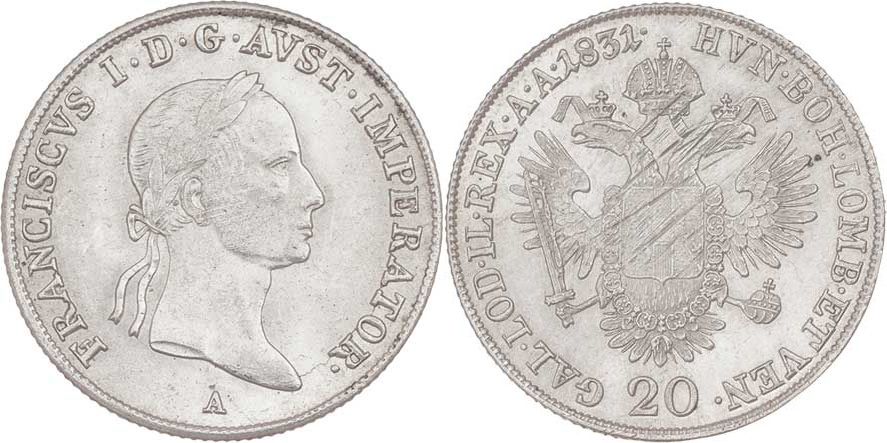 20 Krejcar 1831 A - stuhy volně vlající, 6.692g, mírně just., nep.rysky