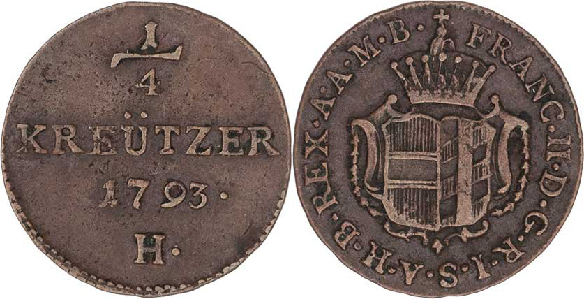 Cu 1/4 Krejcar 1793 H - Günzburg pro Přední Rakousko, 1.828g, nep.nedor., pěkná patina RR!