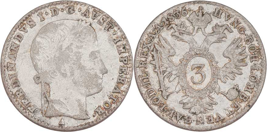 3 Krejcar 1836 A - FERDINANDVS, 1.433g, nep.hr., vl.rysky, pěkná patina R!