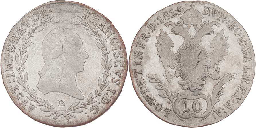 10 Krejcar 1815 B, Kremnica, 3.767g, dr.hr., dr.rysky, patina R!