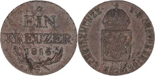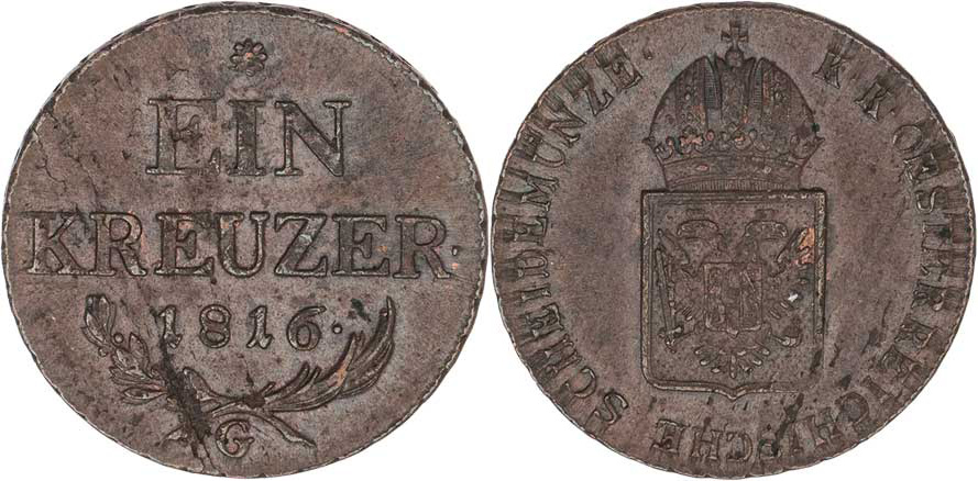 Cu Krejcar 1816 G, Nagybanya, 8.379g, dr.vady mater., pěkná patina R!