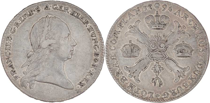 Tolar křížový 1794, Brusel, P.12, 29.254g, mírně just., dr.hr., dr.rysky, pěkná patina R!