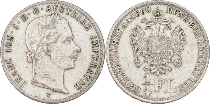 1/4 Zlatník 1860 V, 5.275g, dr.hr., dr.rysky, patina R!
