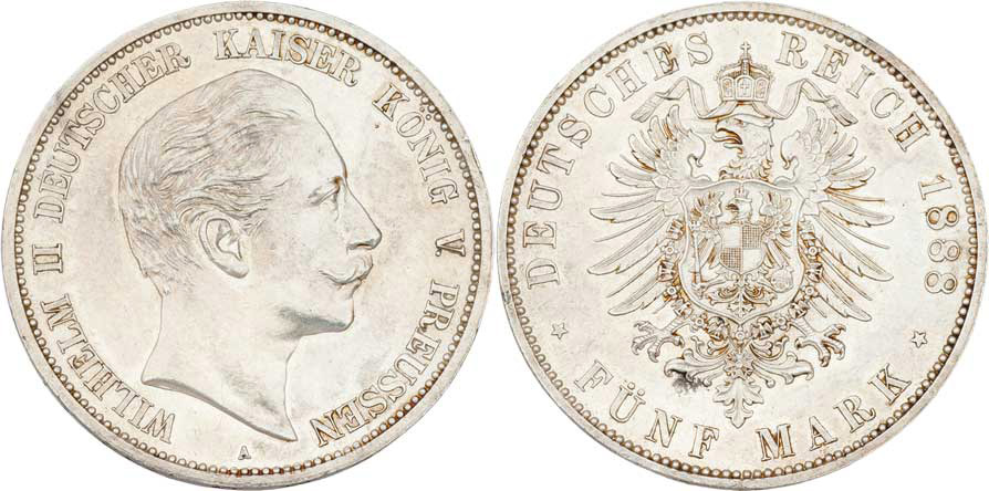 5 Marka 1888 A - malý znak, KM.513 (jediný ročník, pouze 56.000 ks), 27.744g, nep.hr., nep.rys., tém. R!