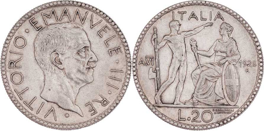 20 Lira 1928 R - rok VI., KM.69 (Ag800), 14.959g, nep.hr., nep.rysky, pěkná patina R!