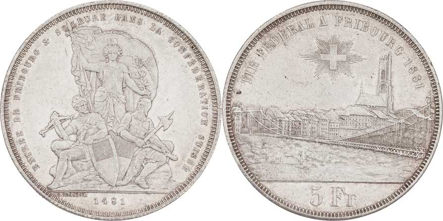 5 Frank střelecký 1881 - Fribourg, KM.S15 (pouze 30.000 ks), 25.013g, dr.hr., dr.rysky R!