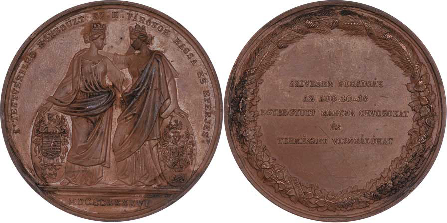 VII.sjezd uherských lékařů v Košicích a Prešově 1846 - personifikace měst, opis a vročení / 5-řádkový nápis ve věnci, Sign., měď 65 mm, dr.hr., rysky, pat.