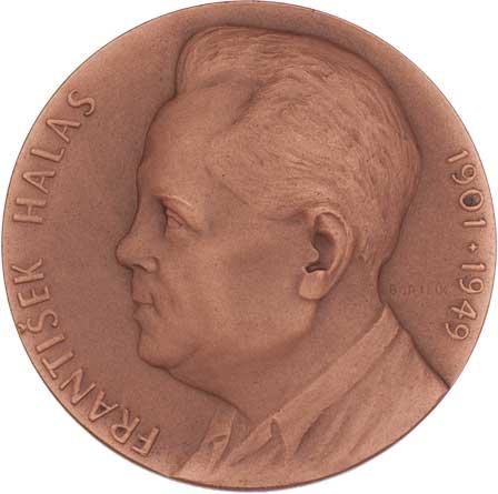 František Halas, básník b.l. - portrét zleva, opis, Sign., patinovaná měď 40mm RR!