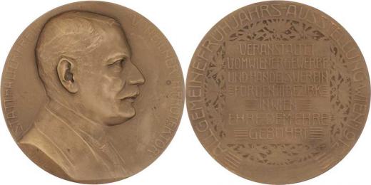 Všeobecná novoroční výstava ve Vídni 1912 - poprsí protektora von Bienerta, opis / 7-řádkový nápis, opis a vavříny, Sign., patin.bronz 60 mm, Haus.7715