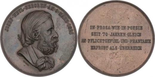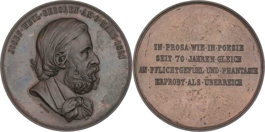 Josef Weyl, rakouský spisovatel - 70.narozeniny 1891 - poprsí zprava, opis / 4-řádkový nápis, Sign., patinovaný bronz 50 mm, Haus.7980, grafitti, téměř