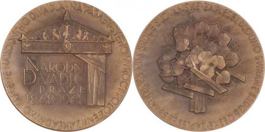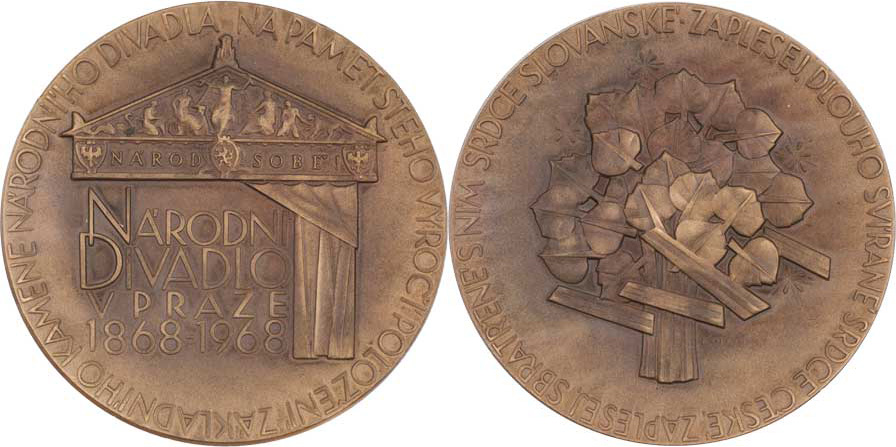 Národní divadlo - 100 let základního kamene 1968 - portik s oponou, 4-řádkový nápis a opis / kytice a opis, Sign., patinovaný bronz 70 mm