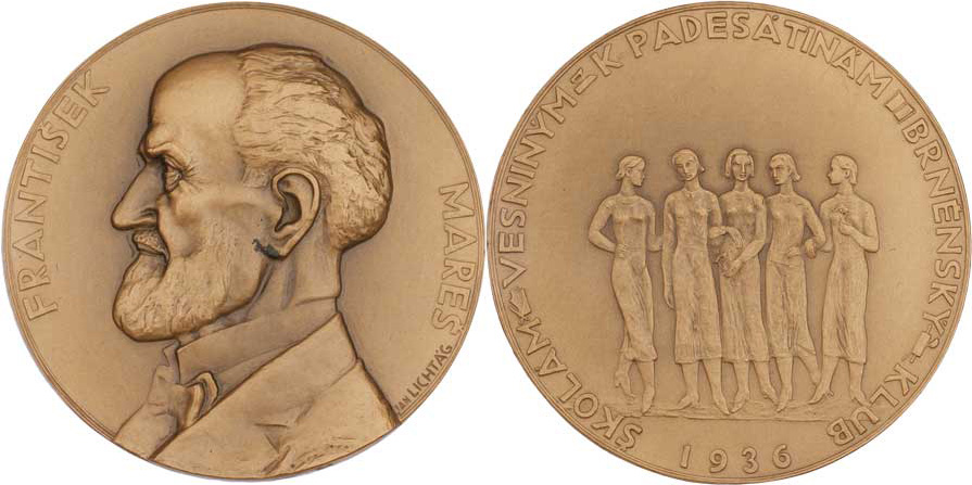 František Mareš - Brno - na 50 let škol Vesny 1936 - poprsí zleva, opis / pět stojících žen s květinami, opis, Sign., patinovaný bronz 70 mm, lakovaný