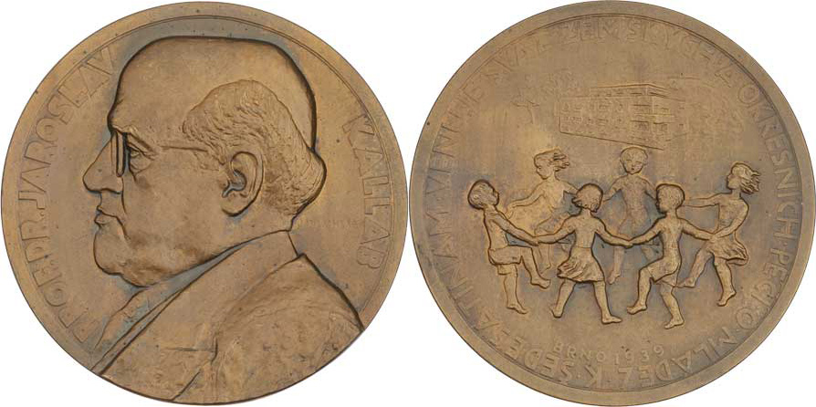 Prof.Dr. Jaroslav Kalláb - Brno 1939 - poprsí zleva, opis / tančící děti, dětský domov, stromy, opis, Sign., patinovaný bronz 70 mm