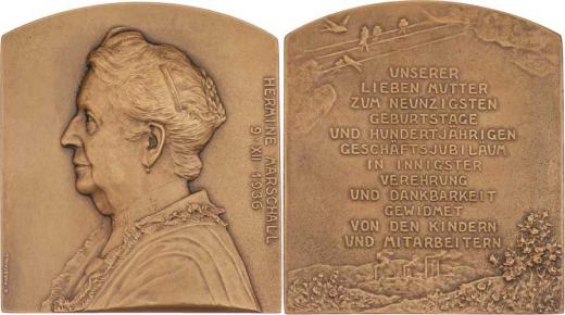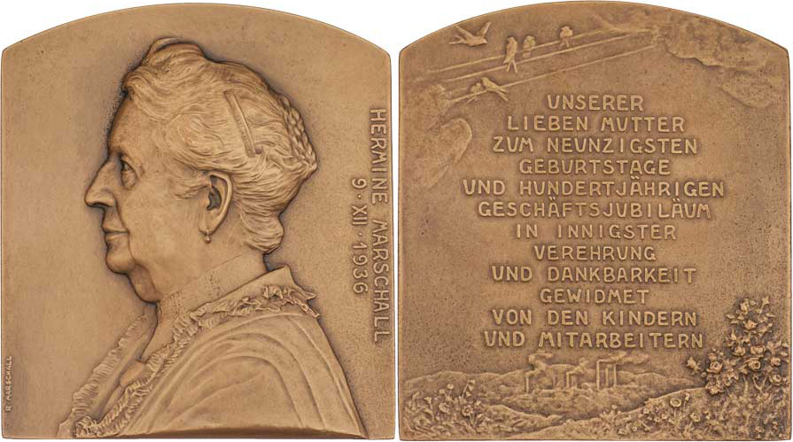 Hermine Marschall - plaketa k 90.narozeninám 1936 - portrét zleva, nápis / 12-řádkový nápis, vlaštovky, továrna v krajině, Sign., patinovaný bronz 72x78 mm