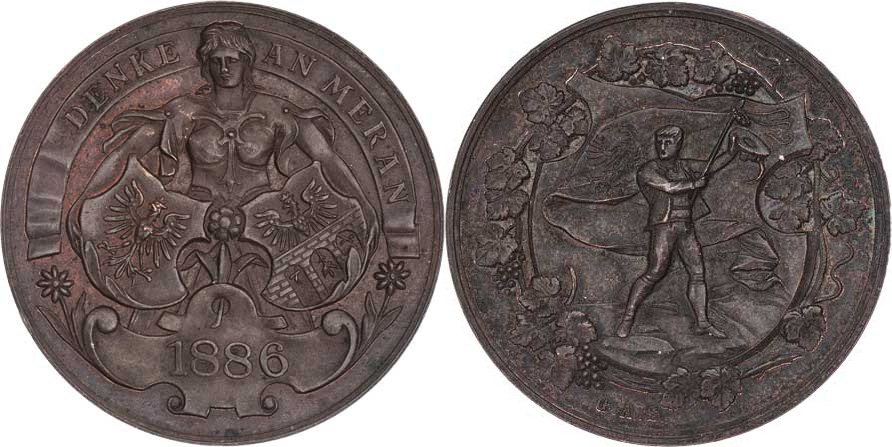 50 let založení lázní Meran 1886 - žena se znaky Tyrol a Merana, opis a vročení / muž s praporem a věnec z vinné révy, Sign., měď 35 mm, pěkná patina