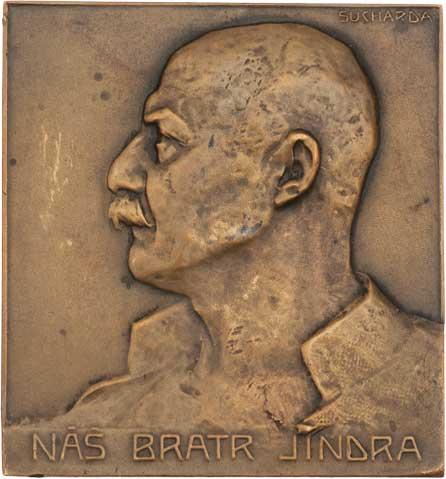 Náš bratr Jindra - jednostr. portrétní plaketa b.l. - poprsí zleva, nápis, Sign., patinovaný bronz 51x56mm, dr.hr., nep.rysky, v reversu dvě dírky se závitem