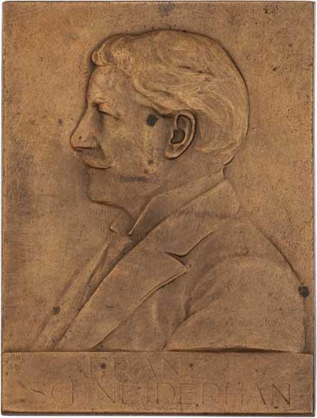 Franz Schneiderhan - cesta do New Yorku 1907 - poprsí zleva, nápis / socha Svobody, nápis, Sign., patinovaný bronz 45x60 mm