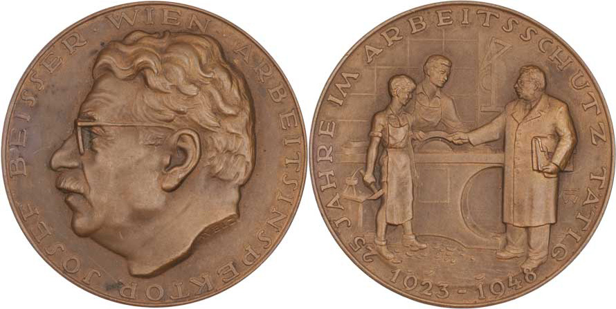 Josef Beisser - pracovní inspektor ve Vídni 1923/1948 - hlava zleva, opis / inspektor v dílně, opis, Sign., patinovaný bronz 60 mm, 105.038g