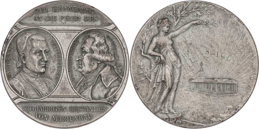 Neuberger - postříbřená medaile na sto let lázní 1908 - oválné medailonky s portréty zakladatelů, něm.nápis / žena, lázeňský pavilon, nápis, Sign., 40mm, patina