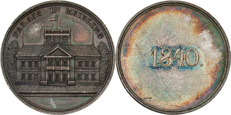 Nesign. - výstavní palác v Meidlingu 1840 - průčelí, opis / vročení, Nepunc., Ag 27mm, 8.530g, patina