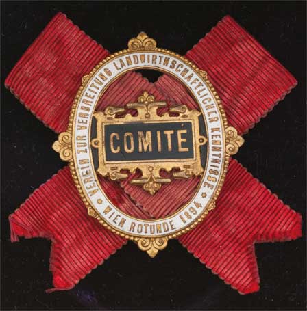 Rotunda - výbor výstavy Hospodářského spolku 1894, Sign.Schwerdtner, honosný zlacený a smaltovaný bronz. odznak, 40x47 mm, dvě stužky, původní etue R!