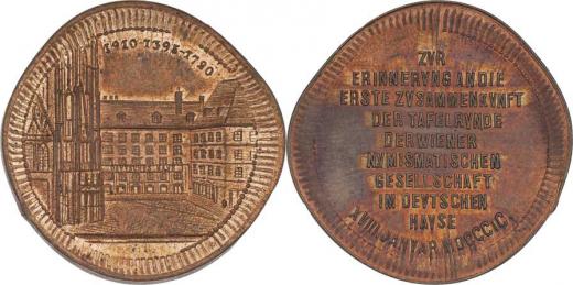 První setkání numismatické stolní společnosti 1899 - Německý dům ve Vídni, vročení / 10-řádkový nápis, Sign.FL, měď 29 mm, chybná ražba nepravidelného tvaru