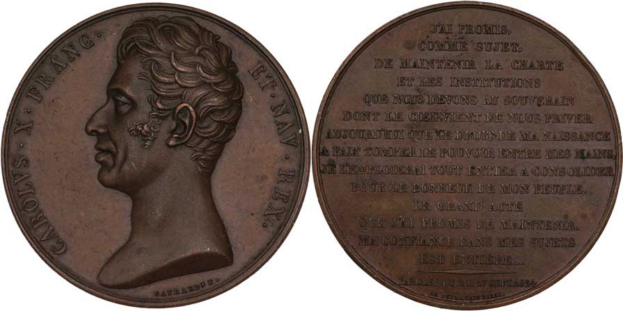 Karel X. - proklamační medaile 17.IX.1824 - poprsí zleva, opis / 15-řádkový nápis, Sign.Gayrard, měď 50mm, 70.164g, krásná patina