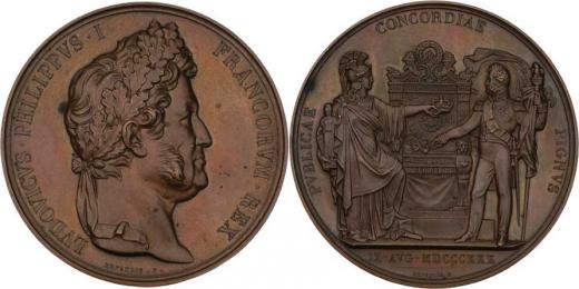 Ludvík Filip Orleánský - korunovační medaile 9.8.1830 - poprsí zprava, opis / korunovační scéna, písmo, Sign. Depaulis, bronz 75mm, 197.407g, skvr., pat. R!