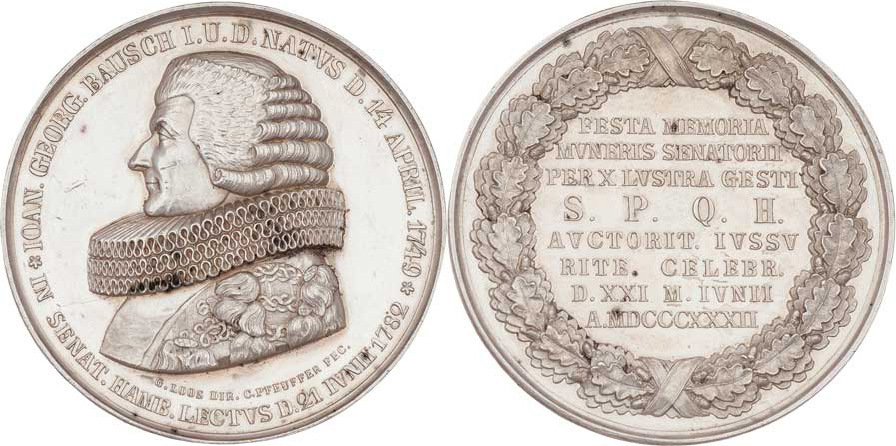Loos - AR medaile senátora Joh. Georga Bausche 1832 - poprsí zleva, opis / 8-řádk.nápis v dubovém věnci, Sign., 42mm, 28.464g, nep.hr., nep.rysky