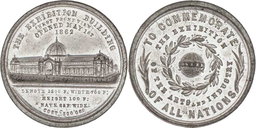 Průmyslová výstava v Londýně 1862 - Crystalpalace, 8-řádkový nápis / vročení na globu, věnec, opisy, ratolesti, Nesign., cín 26 mm, patina