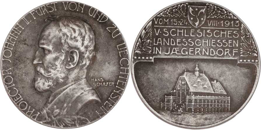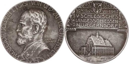 Jaegerndorf (Krnov) 1913 - V.slezské zemské střelby, - Johann kníže Liechtenstein zleva, opis / střelnice, znak a nápis, Sign.Schaefer, patin. Ag 35mm, 17.403g