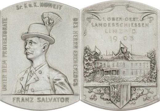 Linec 1903 - poprsí av. Frant. Salvatora zleva, opis/ střelnice, znak, dubové lístky a 4-řádkový nápis, Nesign., Punc., Ag 28x38 mm, 19.416g, etue, téměř