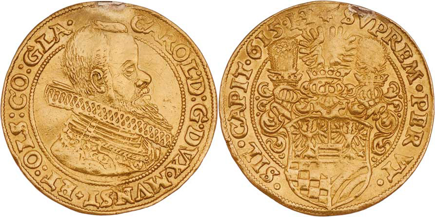 2 Dukát (1)615 HT, Rychleby - Hans Tuchmann, Sa.125 (jako tab.XXVI/34/27), Fr.3245 (2906), 6.728g, stopa po oušku, mírně zvlněný, nep.rysky, pěkná patina RR!
