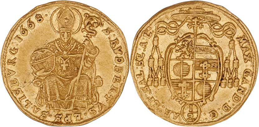 1/2 Dukát 1668, svatý Rupert, opis / znak, opis, Zot.1960, Pr.1634, 1.711g, nep.hr., nep.rysky, dr.vada razidla, nep.zvlněný, pěkná patina R!