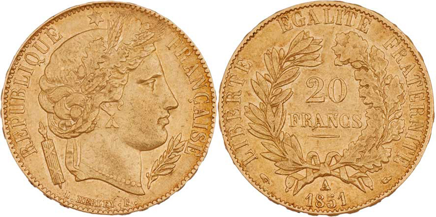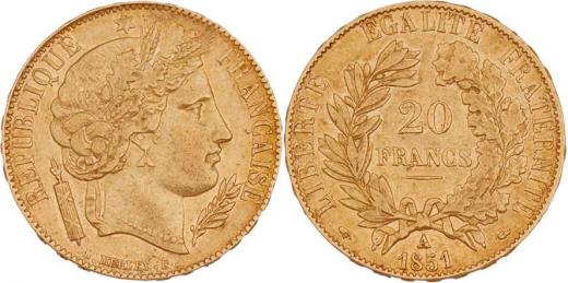 20 Frank 1851 A, Paříž, KM.762 (Au900), 6.423g, nep.hr., nep.rysky, pěkná patina