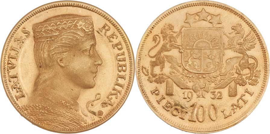 100 Lati 1932 - zlatá puncovaná novoražba podle mince 5 Lati 1932 (cca Au800, minimální náklad), 38.991g