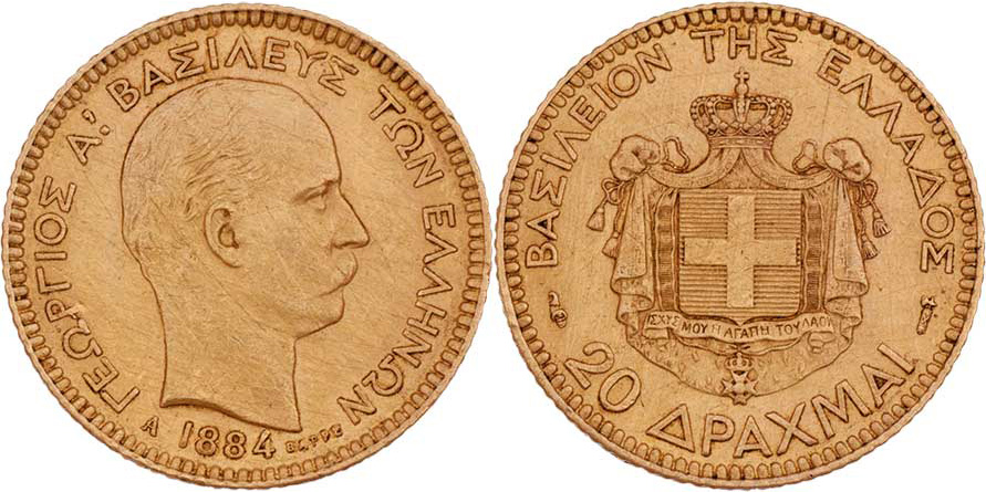 20 Drachma 1884 A, KM.56 (Au900), 6.440g, nep.hr., vl.rysky, patina